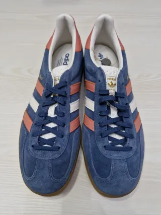 - Tomaia in camoscio blu. - Strisce Adidas bianche. - Dettagli in pelle rosa sul tallone e sui lati. - Suola in gomma.