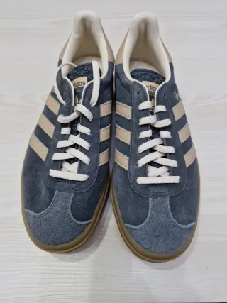 Scarpe Adidas Gazelle in camoscio. - Tomaia in camoscio blu. - Strisce laterali beige. - Suola in gomma. - Dettagli in pelle. - Chiusura con lacci.