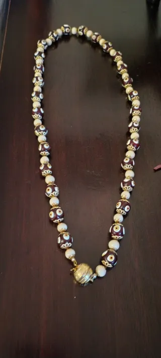 Collana con perle e occhi di agata tibetano decorative e chiusura a innesto misura cm.36 Occhi di agata cm 1 perle cm.0,70 agata ha 4 occhi. - Perle color crema con decorazioni viola e oro. - Chiusura a innesto dorata.
