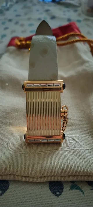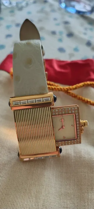 Elegante orologio da polso da donna con dettagli preziosi cinquantesimo anniversario - Cassa e cinturino in finitura oro. - Quadrante con inserti luminosi. - Elementi decorativi in cristallo e pietre scure.
