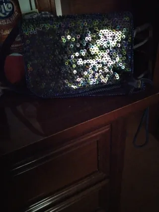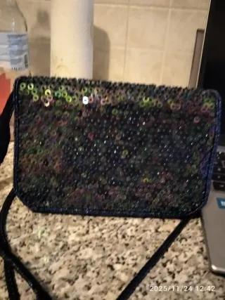 Elegante borsetta con tracolla, perfetta per ogni occasione. - Copertura interamente decorata con paillettes iridescenti. - Rifiniture in perline. - Tracolla sottile e discreta.