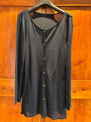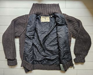Taglia XL. Colore marrone scuro. Foderato, può essere usato come giubbotto. Due tasche esterne laterali a filo. Una tasca interna. Maglia a grana grossa. Collo alto. Composizione come da etichetta interna. Usato poco, in ottime condizioni.
