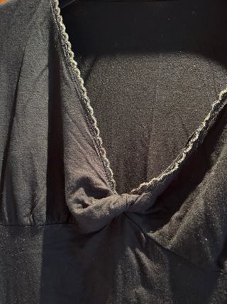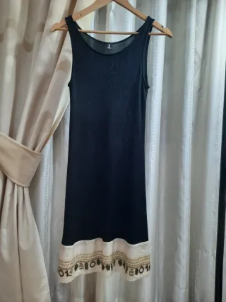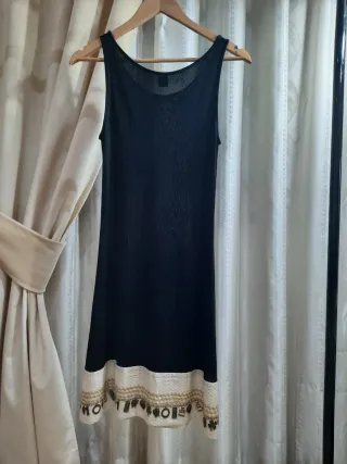 Abito nero con dettagli in pizzo. - Scollo rotondo. - Orlo con bordatura in pizzo color crema e decorazioni. - Tessuto leggero e traspirante.