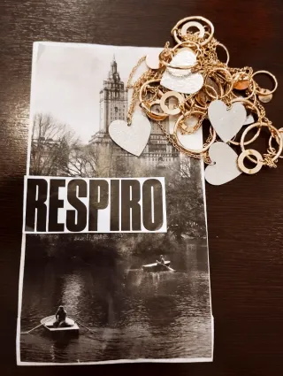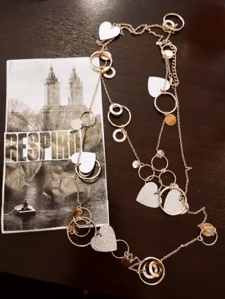 Collana con pendenti a forma di cuore e anelli. - Design a più fili. - Elementi a forma di cuore. - Anelli metallici. - Chiusura a moschettone.