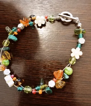 Bracciale fatto a mano con perline. - Chiusura a T. - Perline di varie forme e colori, tra cui fiori e pietre. - Lunghezza regolabile.