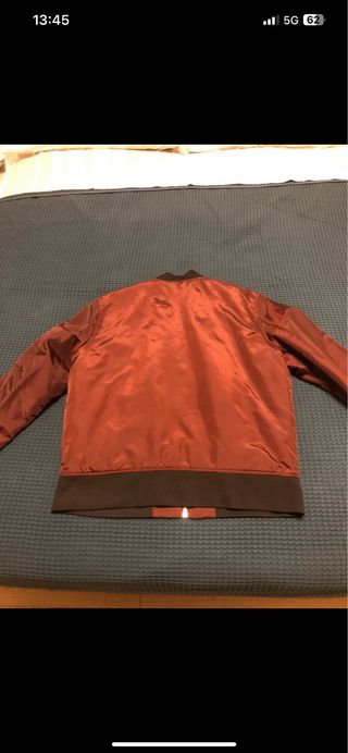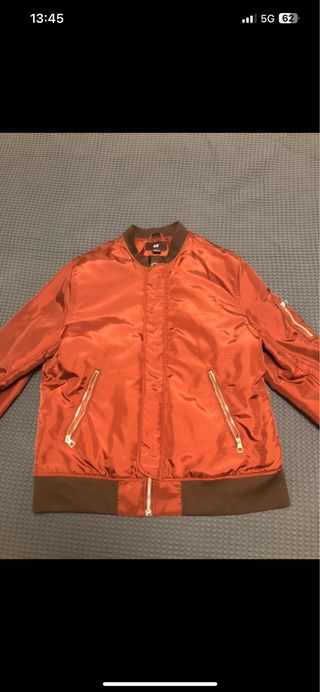Giubbotto stile bomber H&M. - Tessuto lucido arancione. - Dettagli marroni su colletto, polsini e fondo. - Zip frontale. - Tasche laterali con zip. - Tasca sulla manica con zip.