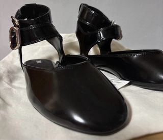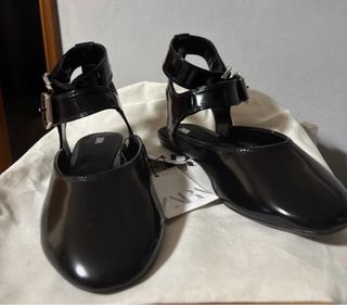 Eleganti ballerine Zara in vernice nera, perfette per completare ogni outfit. - Modello basso. - Dettaglio cinturino alla caviglia con fibbia. - Punta arrotondata.