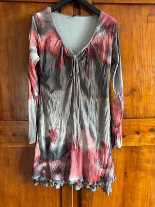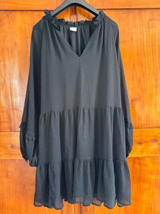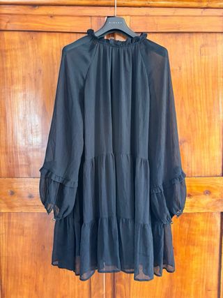 Abitino donna con manica lunga e dettagli a balze. - Tessuto leggero e impalpabile. - Scollo a V con volant. - Maniche lunghe con polsino a volant. - Orlo a balze.