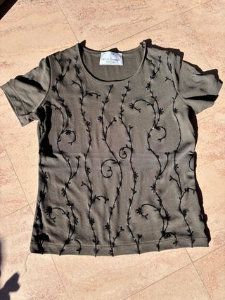 Elegante t-shirt verde oliva con un delicato ricamo floreale. - Maniche corte. - Scollo rotondo. - Motivo floreale con perline e paillettes. - Tessuto morbido e confortevole.
