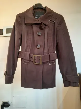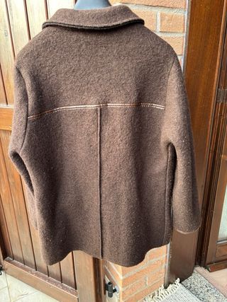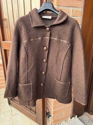 Elegante giacca da donna in lana marrone, perfetta per completare il tuo outfit. - Spalle: 42 cm - Torace: 53 cm - Lunghezza 70 - Dettagli in ecopelle sui taschini e sul bordo.