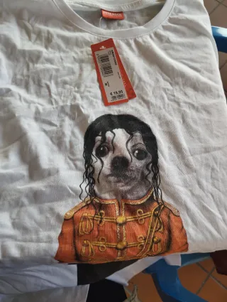 T-shirt bianca con stampa di un cane vestito. - Stampa raffigurante un cane con parrucca e giacca. - Taglia M.