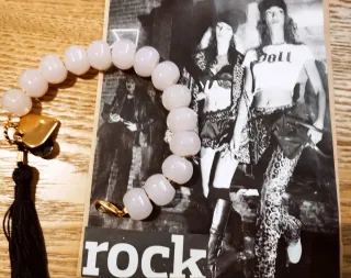Elegante bracciale con pietre di quarzo rosa e un ciondolo nero. Un accessorio unico che aggiunge un tocco di stile. - Pietre di quarzo rosa sfaccettate. - Ciondolo pendente nero. - Dettagli metallici dorati.