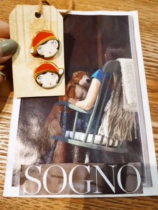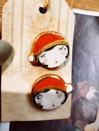 Deliziosi orecchini a forma di bambina con cappellino natalizio. - Design unico e festivo. - Dettagli in smalto e finitura dorata.