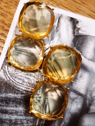 Eleganti orecchini pendenti con pietre quadrate color giallo dorato. - Montatura in metallo dorato. - Dettagli lavorati sulla montatura.