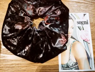 Elastico per capelli di grandi dimensioni, realizzato in tessuto lucido con riflessi rossi. - Tessuto vellutato. - Design ampio e voluminoso.