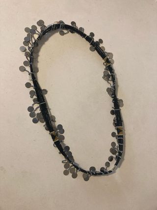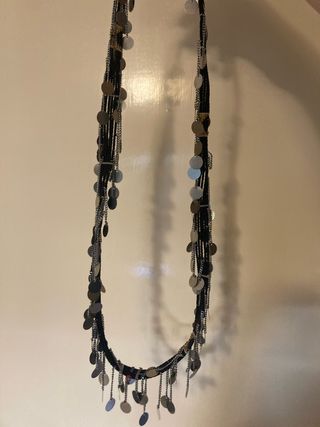 Cintura decorativa con un diseño étnico y llamativo. - Adornada con múltiples monedas plateadas. - Base de cuentas negras.