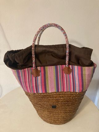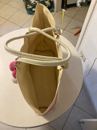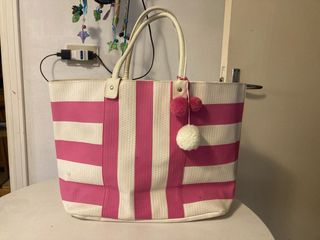 Borsa da spiaggia o da giorno con un vivace motivo a righe. - Design a righe verticali e orizzontali. - Manici bianchi. - Decorata con pompon rosa e bianchi.