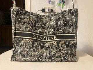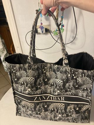 Borsa da mare con una vivace stampa di zebre su tutta la superficie. Presenta una fascia centrale con la scritta ZANZIBAR. - Design unico con stampa zebra. - Fascia decorativa con nome del brand.