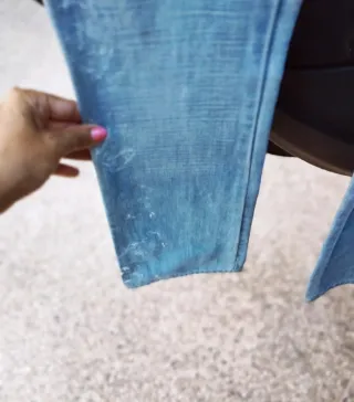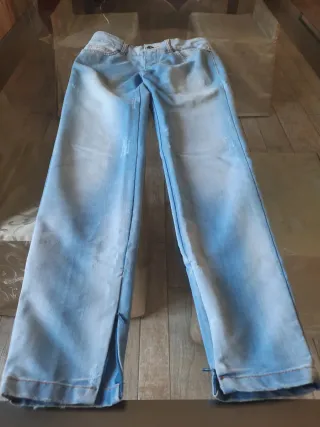Jeans Castellani con un design unico. - Lavaggio azzurro. - Dettagli effetto paint splash bianchi. - Tasche frontali con pieghe. - Inserti strappati e lavorati.
