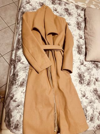 Elegante cappotto da donna in un classico colore beige. Perfetto per completare ogni outfit. - Modello lungo con cintura in vita. - Ampio collo a scialle. - Tessuto morbido e caldo.