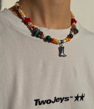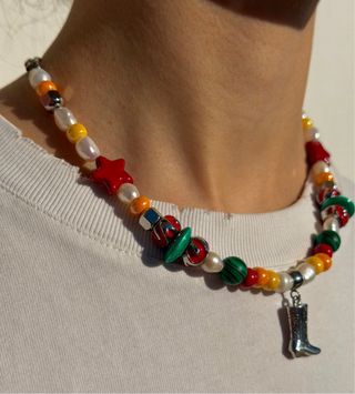 Collana con perle e perline colorate, impreziosita da un ciondolo a forma di stivale. - Perle bianche irregolari. - Perline colorate: rosse, gialle, arancioni, verdi. - Elementi metallici. - Ciondolo a forma di stivale in acciaio inox. #twojeys #collana