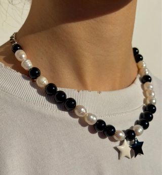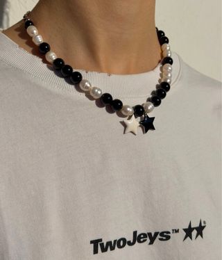 Collana con perle alternate bianche e nere, impreziosita da due ciondoli a forma di stella. - Perle bianche irregolari. - Perle nere lisce. - Ciondoli a forma di stella, uno bianco e uno nero. #twojeys