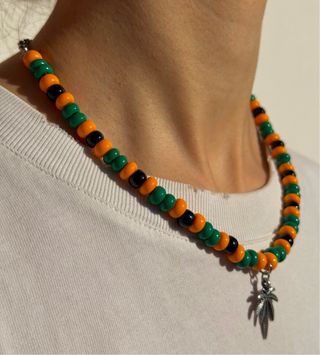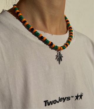 Collana con perline colorate e un ciondolo a forma di foglia. - Perline verdi, arancioni e nere. - Ciondolo in metallo argentato. #twojeys