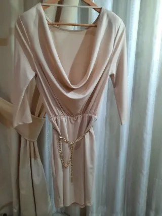 Elegante abito con dettagli raffinati. - Scollo morbido a cascata. - Cintura sottile in catena dorata. - Maniche lunghe. - Vita elasticizzata per una vestibilità comoda.