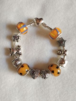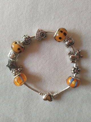 Bracciale in acciaio placcato argento con charm di vari colori e forme, chiusura a forma di cuore, mai indossato. NO repliche NO brand famosi - Acciaio placcato argento - Maglie semi-rigide - Chiusura a forma di cuore (si apre per consentire di aggiungere e togliere i charm) - Lunghezza totale del bracciale 21 cm - Cham vari in acciaio, placcati argento, vetro, cristallo e lega - Numero charm 12 - Sacchetto di organza colorata incluso