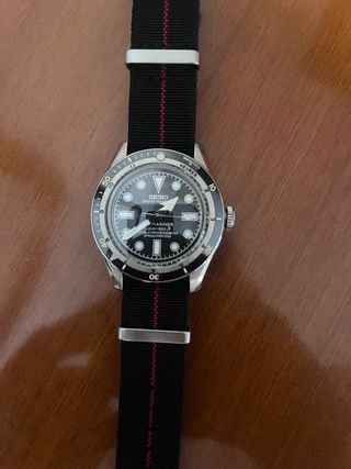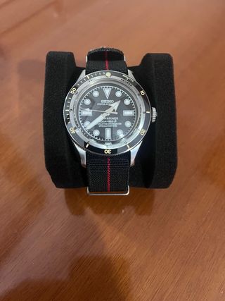 Orologio Seiko modello Submariner. - Quadrante nero. - Ghiera girevole. - Cinturino in tessuto nero con strisce rosse. -Mov: nh35