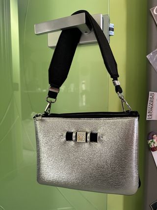Borsa Save My Bag con finitura metallizzata effetto martellato. La tracolla è in tessuto nero. - Chiusura con zip. - Dettaglio frontale con fiocco e placca logo. - Tracolla regolabile e removibile.