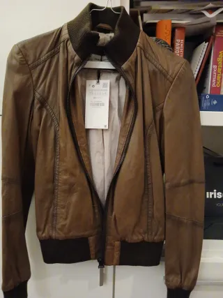 Giubbotto in pelle Zara. - Taglia XS. - Colore marrone. - Chiusura con zip.