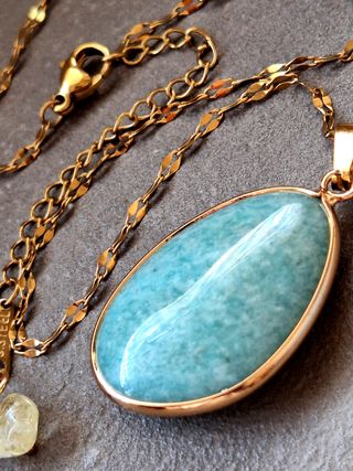 Elegante collana con pendente realizzato in Amazzonite naturale. La catena è in acciaio inossidabile placcata oro 14k lunga 40cm più 5cm di estensione al termine della quale è applicato un charm in Quarzo Citrino. - Pietra: Amazzonite naturale - Montatura: acciaio inossidabile - Lunghezza catena 40cm più 5cm di estensione