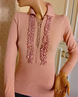 Elegante maglia in misto lana e cashmere, perfetta per aggiungere un tocco di stile al tuo guardaroba. - Collo a polo con dettagli in pizzo. - Maniche lunghe. - Polsini e fondo a costine.