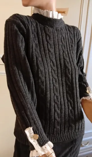 Elegante maglia con dettagli in pizzo sangallo. Un capo versatile e raffinato. - Design a trecce. - Polsini con volant in pizzo e bottone dorato. - Collo giro a costine.