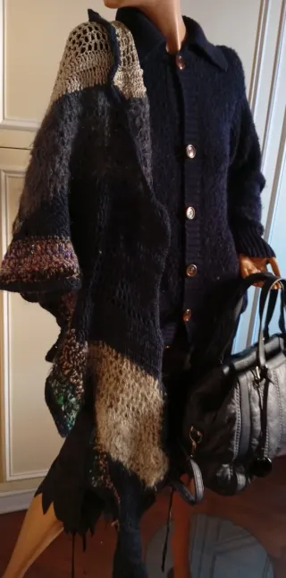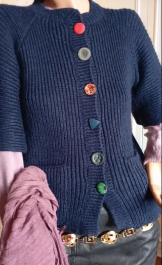 Cardigan blu con un design unico e dettagli vivaci. - Maniche corte a tre quarti. - Chiusura con bottoni colorati - Tasche frontali applicate. - Collo rotondo.
