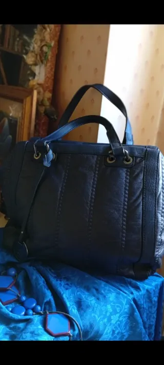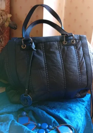 Elegante borsa a spalla blu - Dettagli trapuntati verticali sul davanti. - Bordi con lavorazione intrecciata. - Ciondolo rotondo in metallo con logo. - Manici superiori.