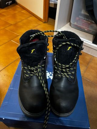 Scarponcini Goodyear in pelle nera. - Lacci gialli a contrasto. - Fodera interna a quadri. - Collo imbottito in velluto a coste. - Comodi e impermeabili