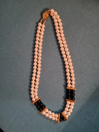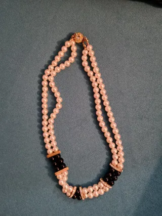 Elegante collana a due fili con perle. - Perle bianche. - Dettagli neri. - Chiusura dorata con strass.