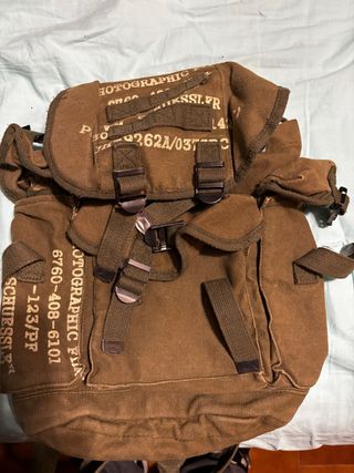 Zainetto in stile militare, perfetto per un look vintage. - Tessuto resistente color verde oliva. - Dettagli con scritte PHOTOGRAPHIC e codici. - Chiusure a fibbia e cinghie regolabili.