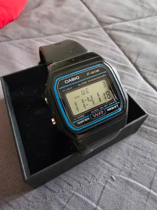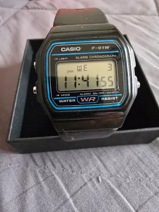Orologio digitale Casio modello F-91W. Usato, con qualche segno dul quadrante, ma perfettamente funzionante, ha le classiche funzioni, svaglia, cronometro e illuminazione led