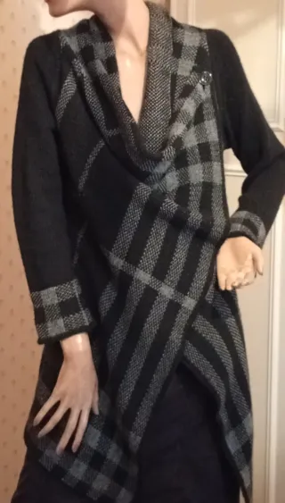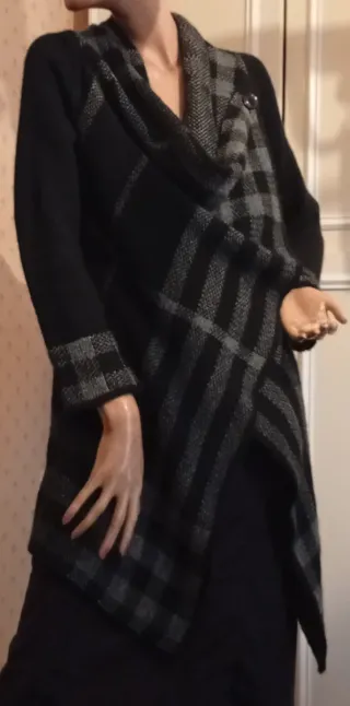 Cardigan asimmetrico con fantasia a quadri e righe. - Design avvolgente. - Maniche lunghe. - Orlo asimmetrico.