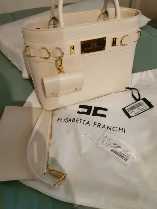 Borsa Elisabetta Franchi in tonalità beige con dettagli oro. - Logo frontale in metallo dorato. - Dettagli con fibbie e anelli dorati. - Charm portamonete agganciato. - Dustbag inclusa.