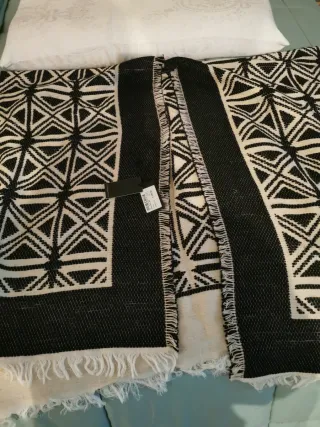 Mantella con un design geometrico in bianco e nero, rifinita con frange. - Motivo a rombi e triangoli. - Bordi sfrangiati.