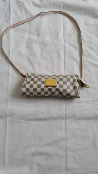Pochette Louis Vuitton con tracolla, perfetta per ogni occasione. Il design a scacchiera la rende unica. - Motivo a scacchiera beige e grigio. - Tracolla regolabile. - Dettagli dorati.