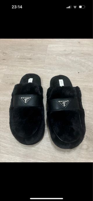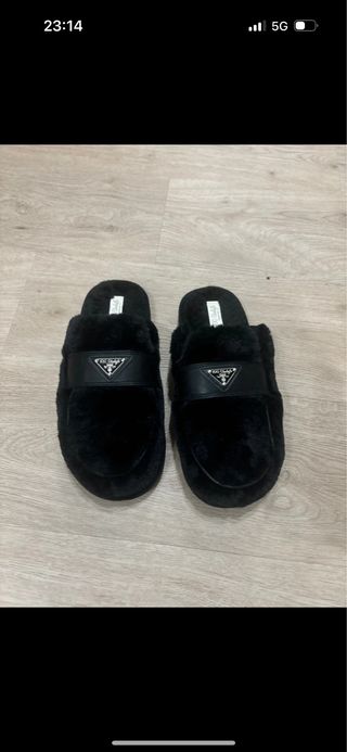 Comode ciabatte in morbida pelliccia sintetica, perfette per stare in casa con stile. - Logo Prada triangolare in pelle sul davanti. - Fodera interna in pelliccia sintetica. - Suola in gomma.
