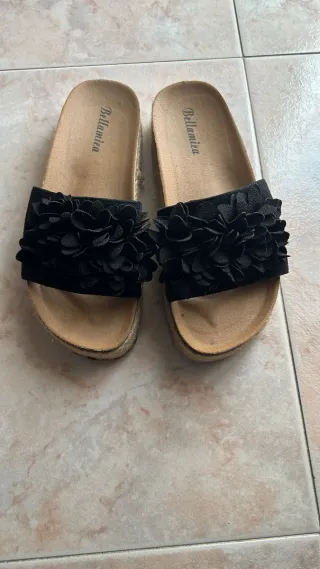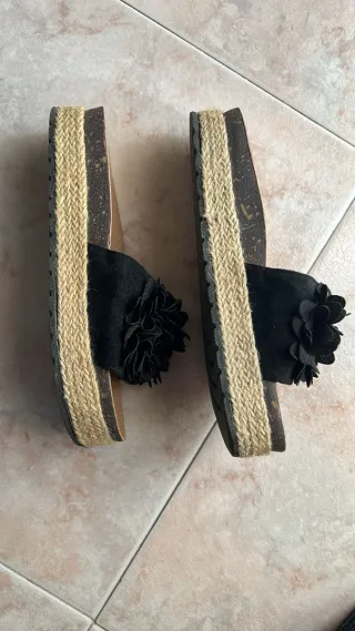 Vendo un paio di ciabatte estive. Sono nere e hanno due cinturini regolabili con fibbia. La suola è in sughero e corda. Sono in buone condizioni.