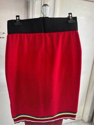 Gonna a tubino dal colore rosso vivace, con una fascia elastica nera in vita e un dettaglio a righe sul fondo. - Fascia elastica nera in vita - Dettaglio a righe colorate sul fondo