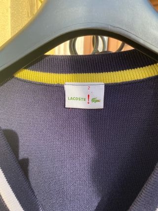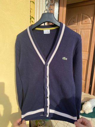 Cardigan Lacoste da uomo, un capo versatile e di stile. - Colore blu con dettagli bianchi. - Logo Lacoste ricamato sul petto. - Chiusura con bottoni. - Scollo a V con bordi a contrasto.