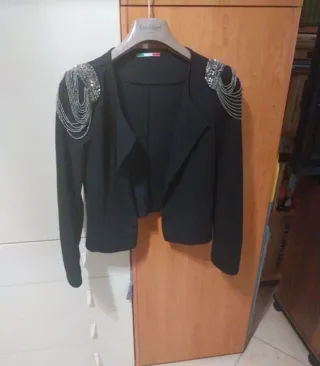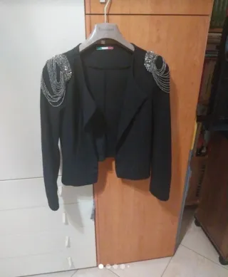 Elegante giacca corta con dettagli luminosi sulle spalle. - Maniche lunghe. - Design aperto sul davanti. - Decorazioni con perline e catenelle sulle spalle.